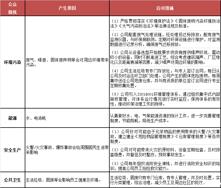 针对公众关注的环保、节能、安全生产等重点,公司不等不靠,主动担责,坚持问题导向,加大化解隐忧。针对公众隐忧的原因分析及采取措施见表1。